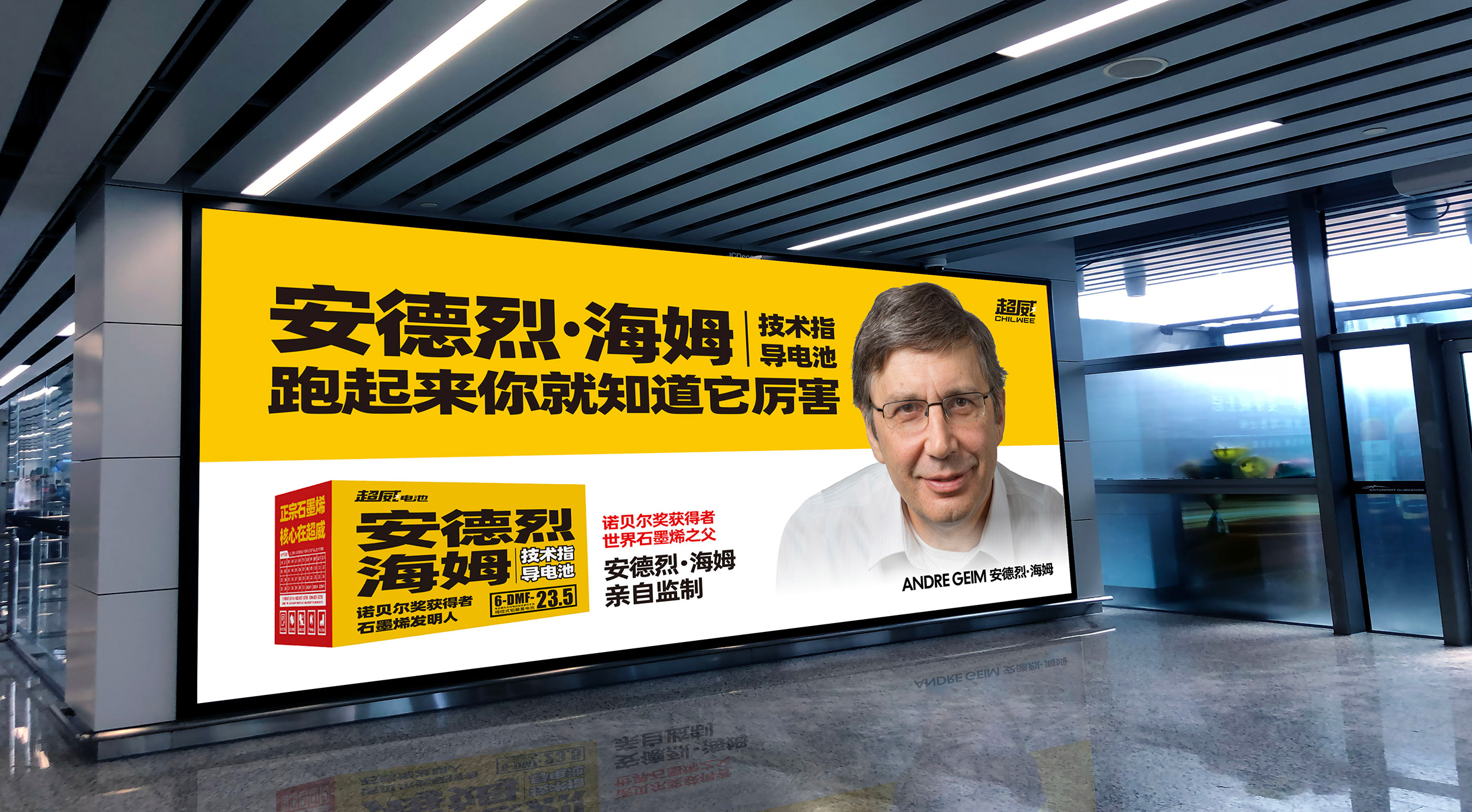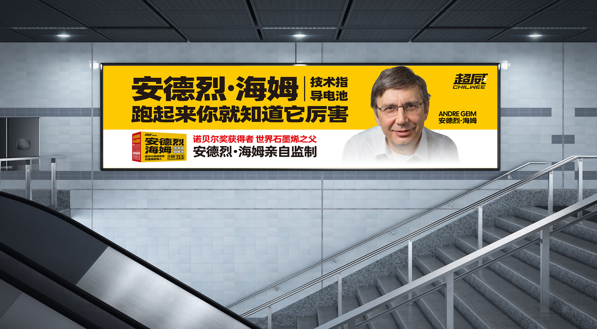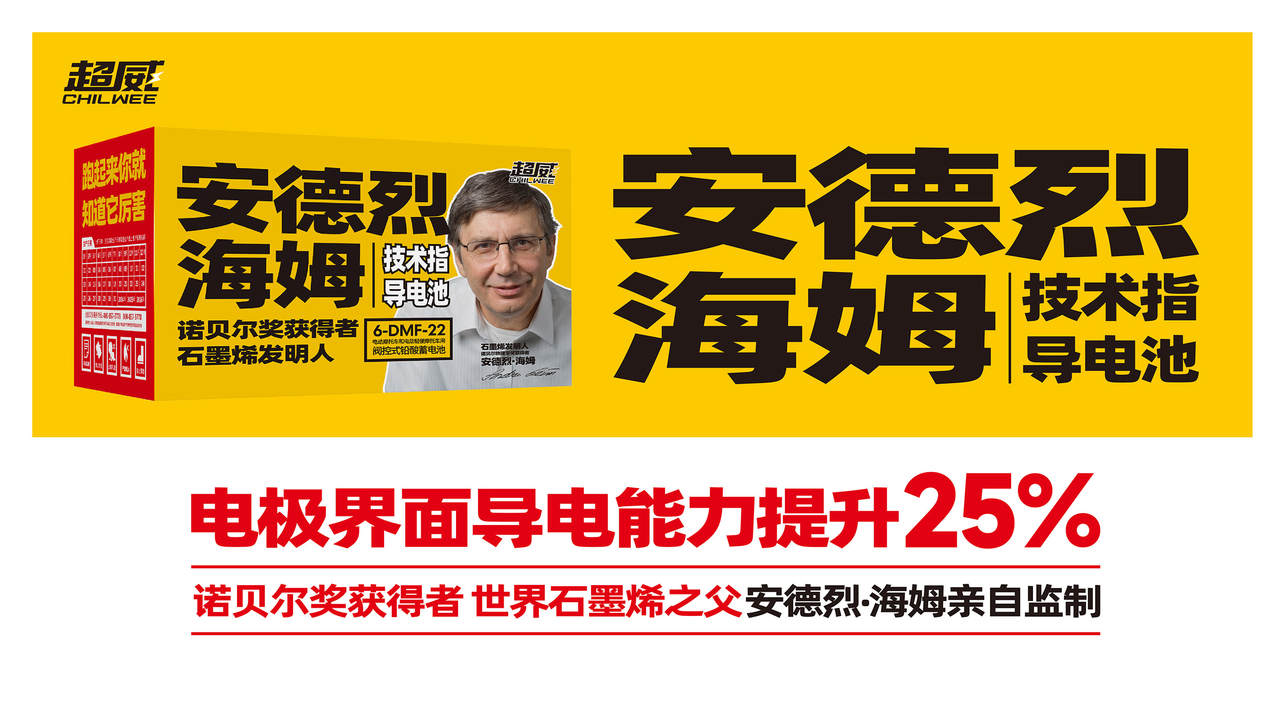 在平面海报的设计上,张默闻这厮还特别设计了两个版本。第一个品牌版海报重点聚集核心广告语“跑起来你就知道它厉害”,采用超威黄白配色,上下构图,放大超威集团技术顾问安德烈·海姆教授的个人形象,重点标红“诺贝尔奖获得者、世界石墨烯之父”的关键信息,通过高效链接这位世界级大咖,借势科技巨擘的影响力来提高超威的品牌与产品势能。在第二个产品卖点版海报中,张默闻这厮同样采用超威黄白作为主配色,但与前者不同的是,除去安德烈·海姆教授的个人形象,采用了左右构图法,左边单品,右边文案,将这款超级单品的包装极致展现,新颖醒目,视觉冲击强。海报右边,除了放有“安德烈·海姆技术指导电池”的单品名和“诺贝尔奖获得者,世界石墨烯之父安德烈·海姆亲自监制”的关键信息之外,还特别放置了“电极界面导电能力提升25%”这一核心卖点,从差异点到利益点的打通、打透,为超威品牌形象塑造和单品动销注入了强大动力。