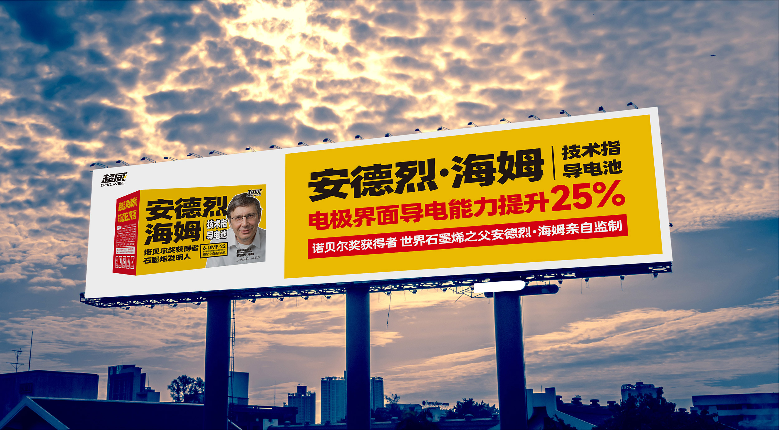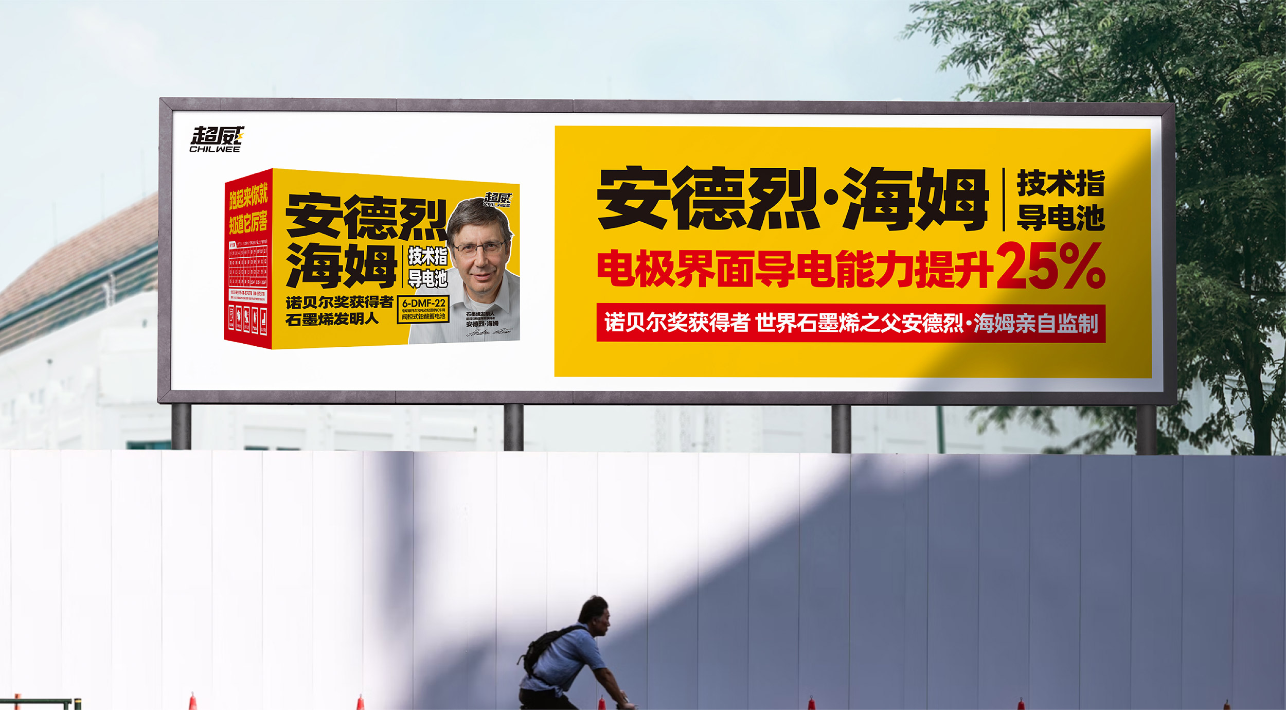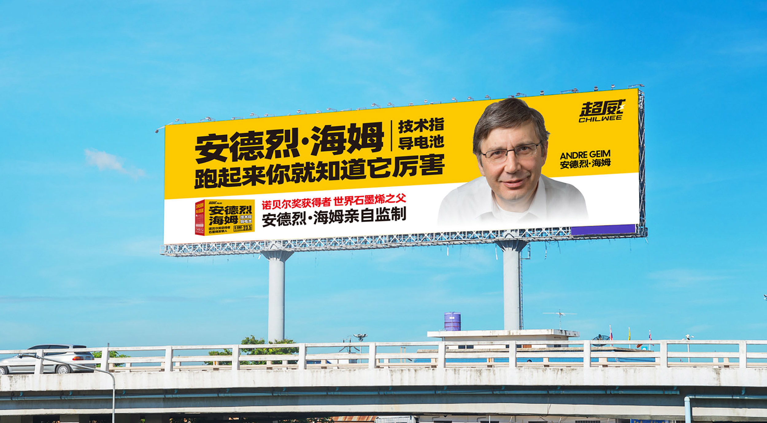 在平面海报的设计上,张默闻这厮还特别设计了两个版本。第一个品牌版海报重点聚集核心广告语“跑起来你就知道它厉害”,采用超威黄白配色,上下构图,放大超威集团技术顾问安德烈·海姆教授的个人形象,重点标红“诺贝尔奖获得者、世界石墨烯之父”的关键信息,通过高效链接这位世界级大咖,借势科技巨擘的影响力来提高超威的品牌与产品势能。在第二个产品卖点版海报中,张默闻这厮同样采用超威黄白作为主配色,但与前者不同的是,除去安德烈·海姆教授的个人形象,采用了左右构图法,左边单品,右边文案,将这款超级单品的包装极致展现,新颖醒目,视觉冲击强。海报右边,除了放有“安德烈·海姆技术指导电池”的单品名和“诺贝尔奖获得者,世界石墨烯之父安德烈·海姆亲自监制”的关键信息之外,还特别放置了“电极界面导电能力提升25%”这一核心卖点,从差异点到利益点的打通、打透,为超威品牌形象塑造和单品动销注入了强大动力。