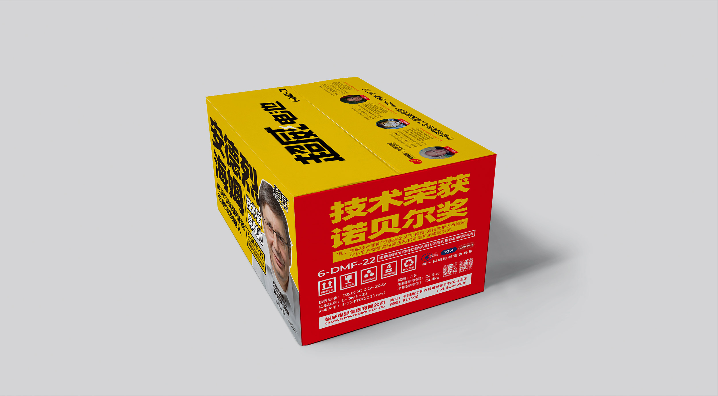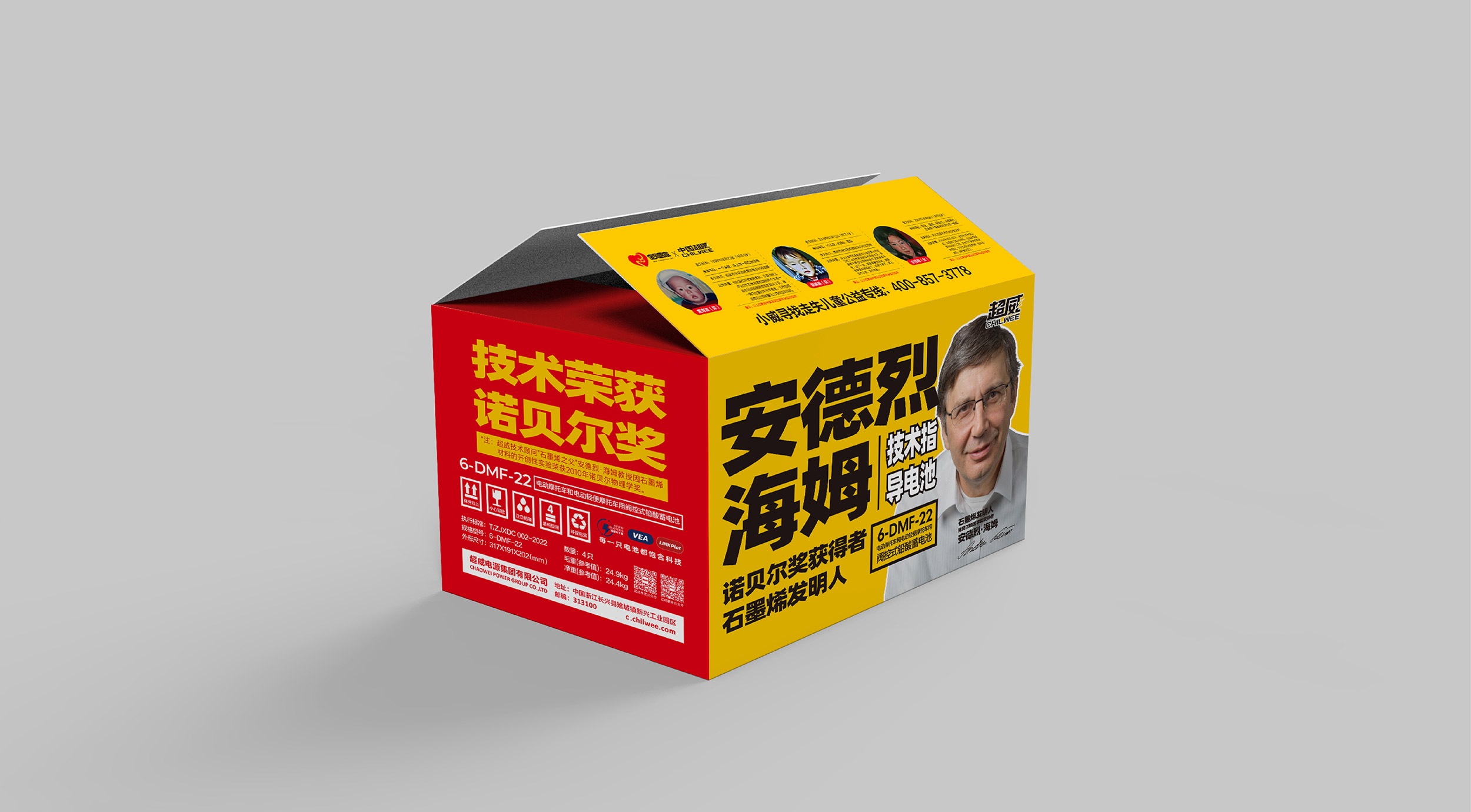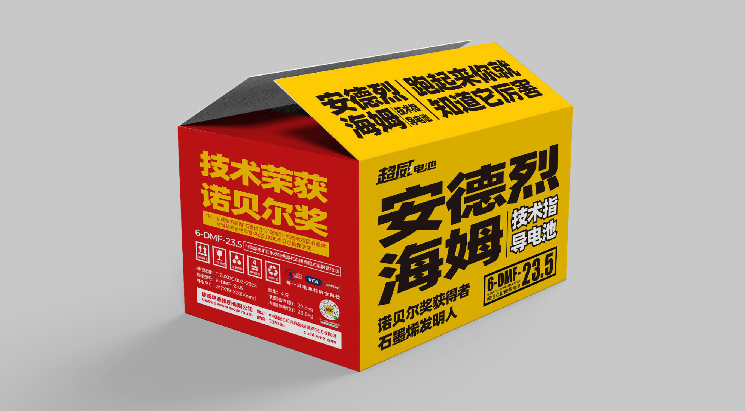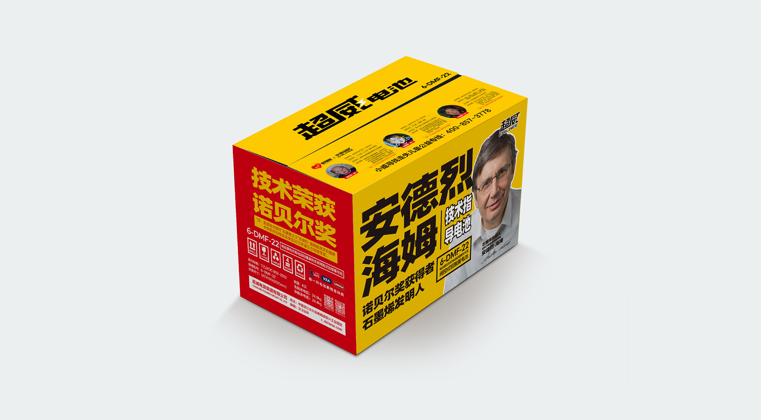 在包装设计上,整体采用红黄配色,包装正面的超威黄明度高,侧面的红色明度低,二者相互搭配,协调统一又有很强的对比。包装正面,张默闻这厮采用大字报的版式设计,将“安德烈海姆”“技术指导电池”“诺贝尔奖获得者石墨烯发明人”及电池型号整齐排版,同时特别放大“安德烈海姆”关键词,醒目文字,确保信息一目了然。包装两侧,一面印有“技术荣获诺贝尔奖”,并在下面有一行标注“超威技术顾问石墨烯之父安德烈·海姆教授因石墨烯材料的开创性实验荣获2010年诺贝尔物理学奖”;另外一面则印有“正宗石墨烯,核心在超威”,核心内容重点透出,极大提高超威品牌的传播率。在包装顶部,将电池名称和广告语组合排列,黄底黑字,醒目直观,让消费者一眼就能看出核心传播点。超级包装,每一面各有重点,面与面之间重点信息又能相互配合,高效传达出品牌信息,打造差异化单品优势。