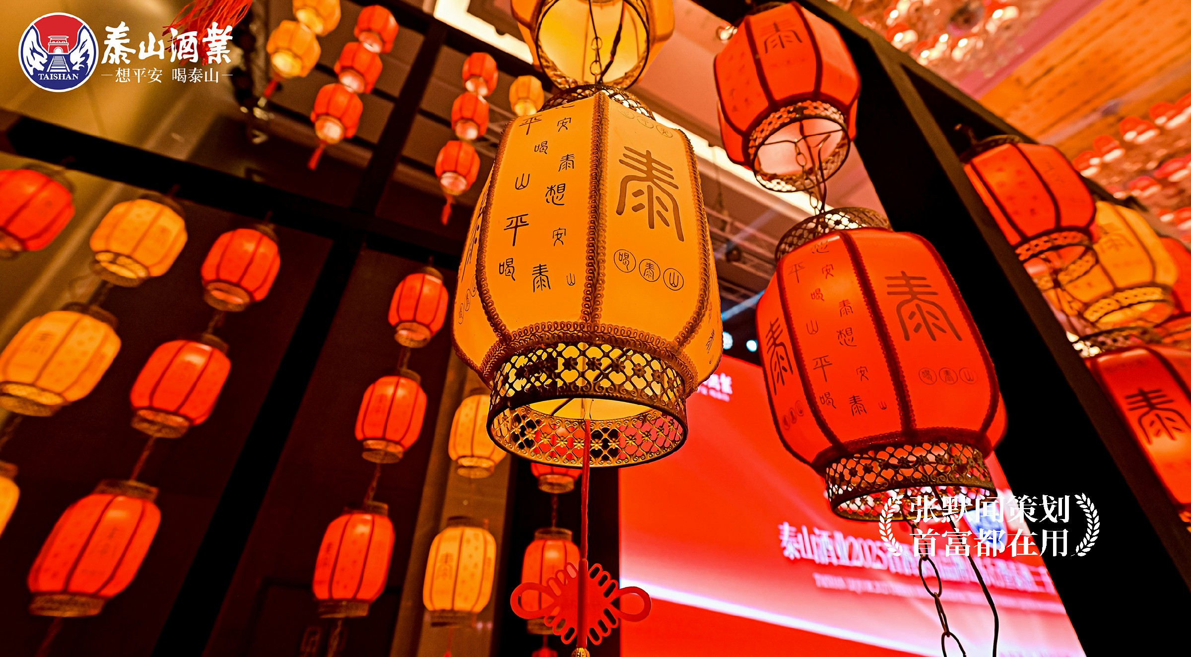 步入会场,仿佛置身于大秦宴席,开启一场古今交融的文化对话。放眼望去,从道路两侧一路悬挂至会场的“泰”字军旗迎风招展,彰显出泰山酒业80年的辉煌历程;舞台两侧的灯笼巧妙地组合成“平安”二字,向每一位来宾传递诚挚的平安祝愿;舞台后方巨幅长卷徐徐展开,以篆书写的泰酒12金句赫然呈现,镌刻出泰山酒业深厚的文化底蕴。诸多元素呼应联动,共同构筑出一场视听交融、意蕴绵长的品牌盛宴。