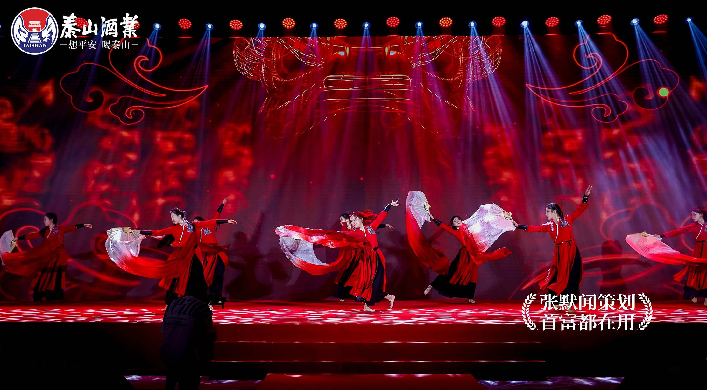 平安宴在张默闻这厮的设计下,精彩无限,给参宴来宾带来一场视觉、听觉、味觉的多重体验。晚宴由《泰酒平安舞》翩然启幕,八名舞者以灵动舞步演绎泰酒浓柔留香,以磅礴气势传递千年平安祈愿,一舞呈祥、祝福满场。舞毕,现场举行献平安石仪式,经碧霞祠祈福的平安石,承载着元君之福与泰酒之诚,表达了对来宾平安吉祥、商运亨通的美好祝愿。平安宴献平安石,将宴会引入第一个高潮。