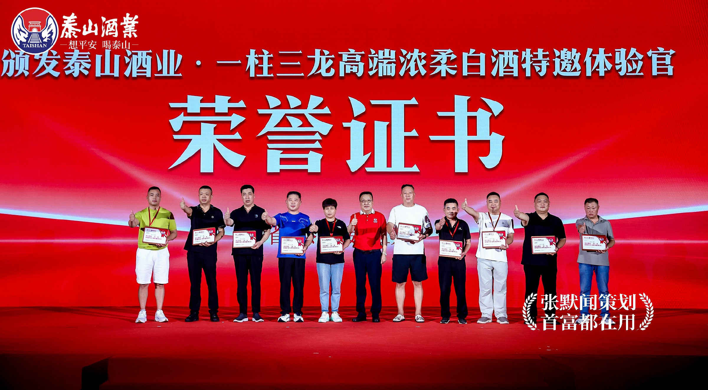 为感谢各位体验官的专业洞察和对泰山酒文化传播的支持,泰山酒业董事长张铭新先生亲自为他们颁发了“泰山酒业·一柱三龙高端浓柔白酒特邀体验官”证书,赋予品鉴隆重的仪式感和荣誉感。这一环节将现场氛围推向情感的高点,进一步强化了品牌与消费者之间的情感联结,彰显了泰山酒业以卓越品质与消费者共建信任、携手传承酒文化的美好愿景。
