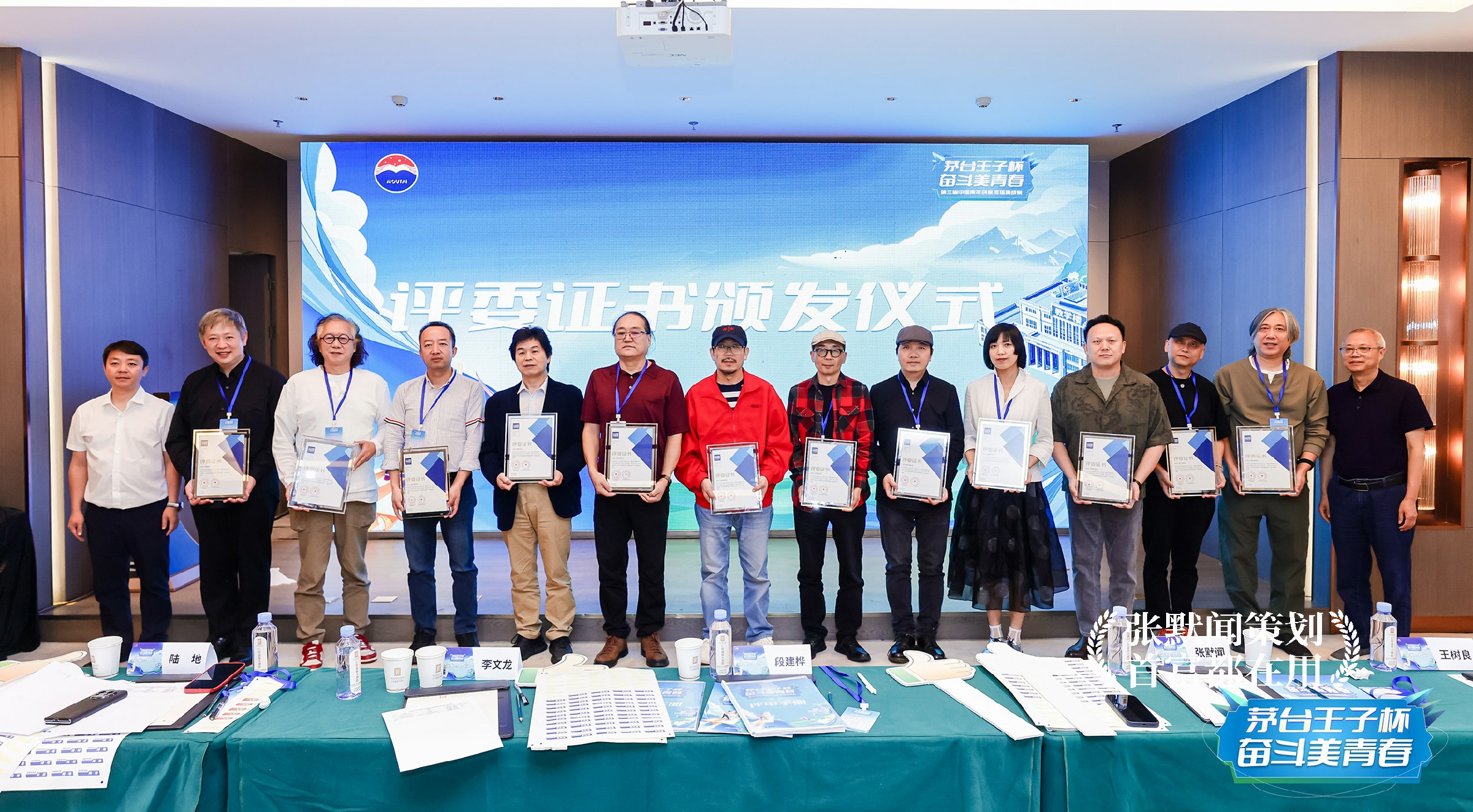 贵州茅台酱香酒营销有限公司党委委员、副总经理卓洋洋在致辞中表示:“茅台王子酒的理念是‘致敬奋斗者’,在这个主题下,我们已经连续3年收获了许多极具创意的品牌表达,后续我们也希望能够陆续把年轻人的创意成果应用到实践中来,真正实现用年轻创意赋能茅台王子酒品牌建设。”连续三年担任评审主任的张默闻这厮也指出,“奋斗”一词已通过赛事实现“品牌化、创意化、年轻化”,茅台王子酒与大学生组成新的“奋斗CP”,正逐步成为品牌文化传承与时代精神表达的重要符号。现场,段建桦及张贵超两位茅台集团领导为到场评委颁发评委证书,感谢大家对于茅台王子杯大赛的支持,并期待专家评委未来能为大赛提升水平,引领创意水准。