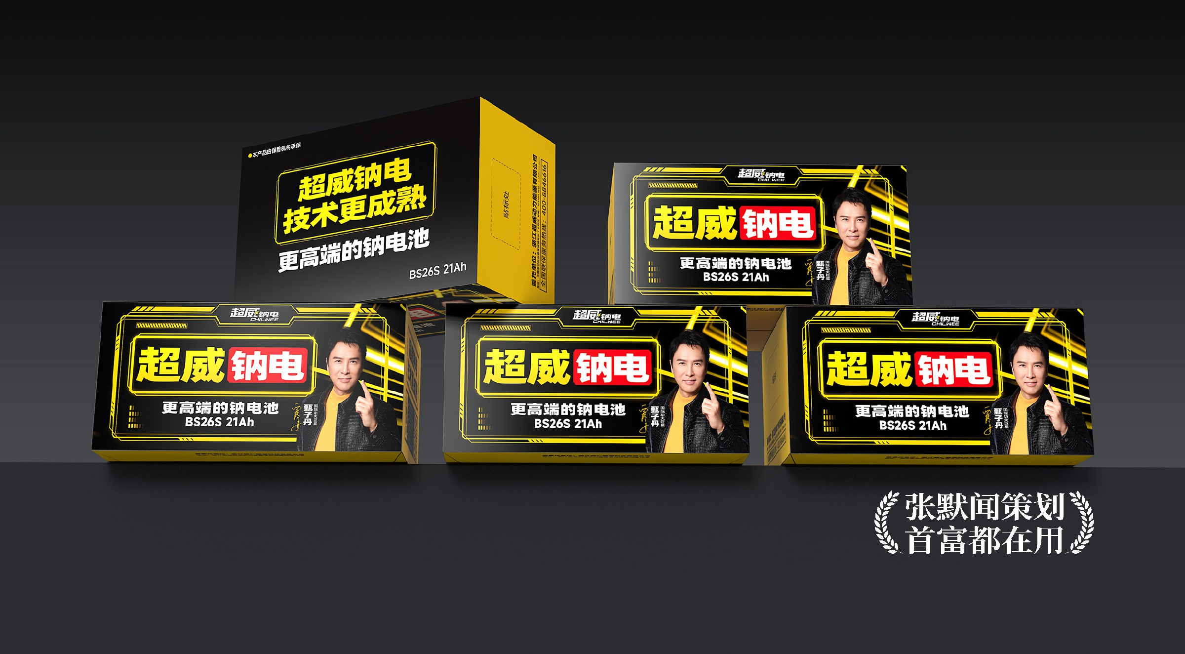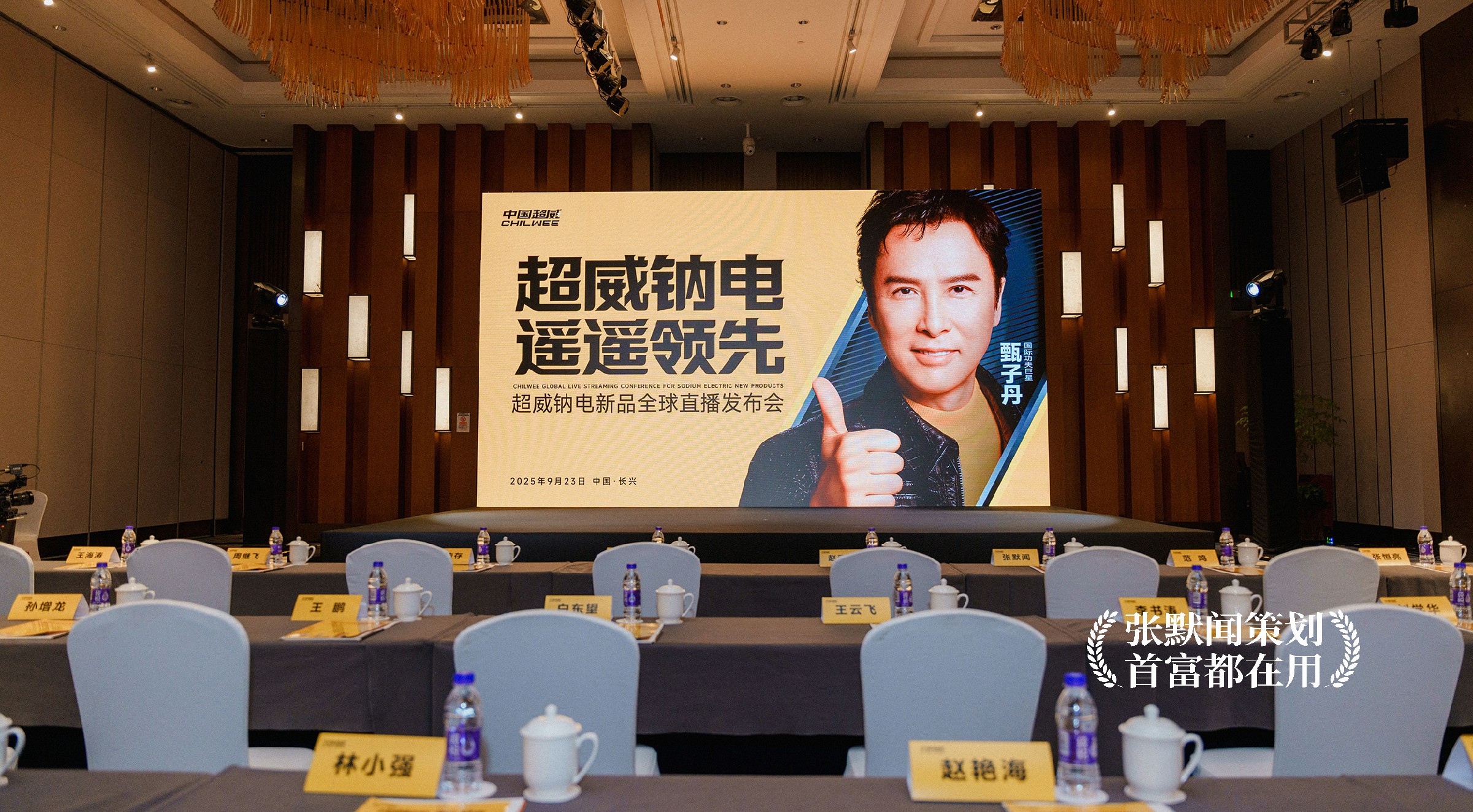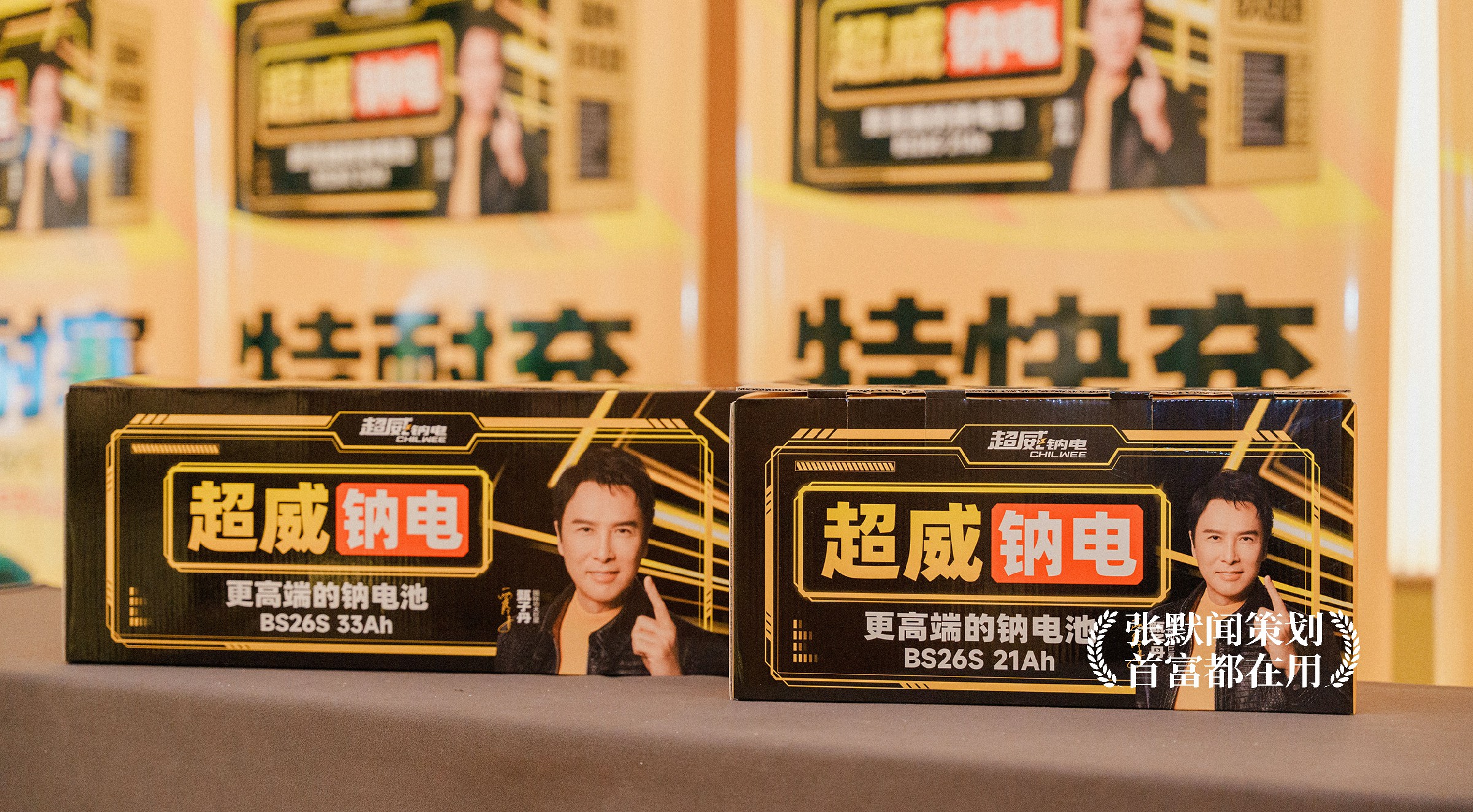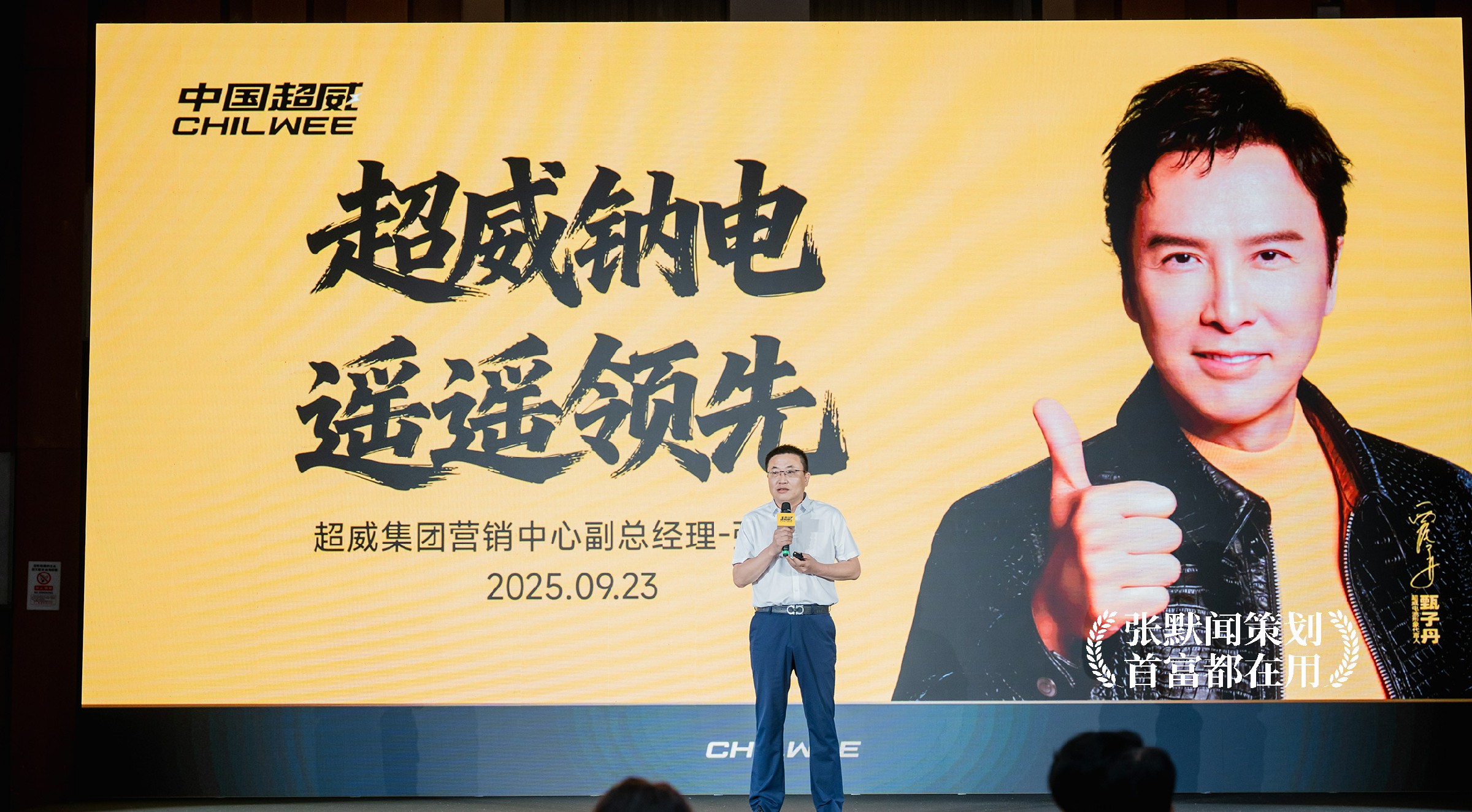 在本次大会的主画面设计上,明亮的超威黄色、醒目的大会主题“超威钠电 遥遥领先”、耀眼的国际功夫巨星甄子丹微笑点赞,三者相互配合,形成强烈的视觉冲击,传递出产品值得信赖的承诺。特别是在代言人甄子丹的形象处理上,银灰色的背景设计与超威黄形成对比,增强了画面的层次感与立体感,让甄子丹的形象和发布会主题更加突出。整个设计沉稳大气,科技感十足,进一步烘托出了超威钠电的品牌实力。