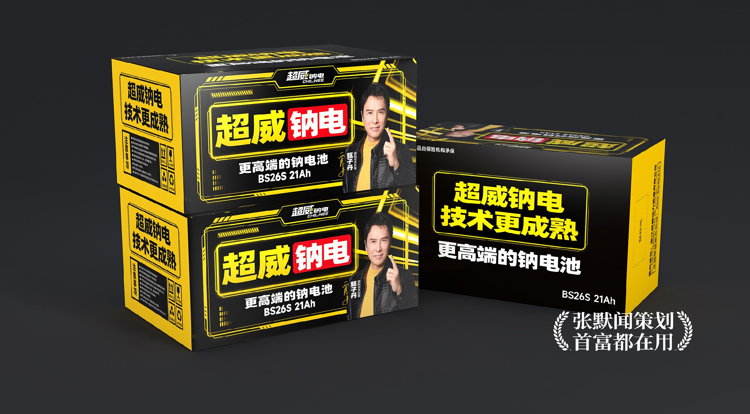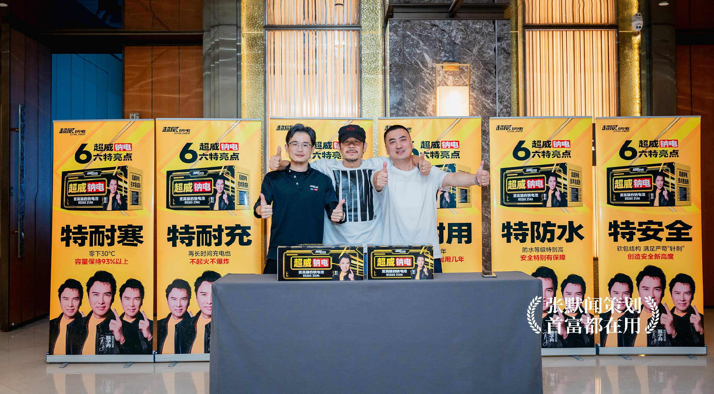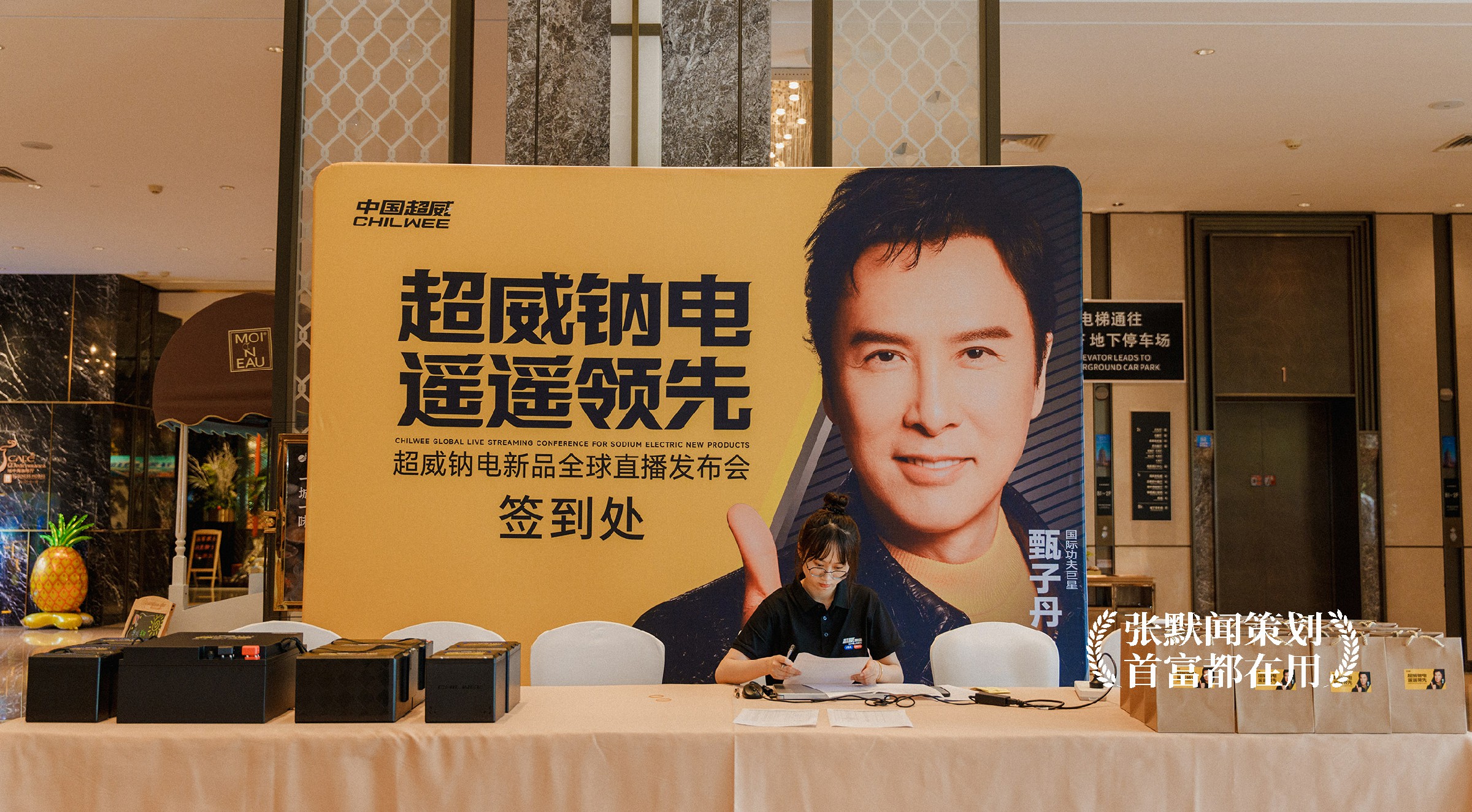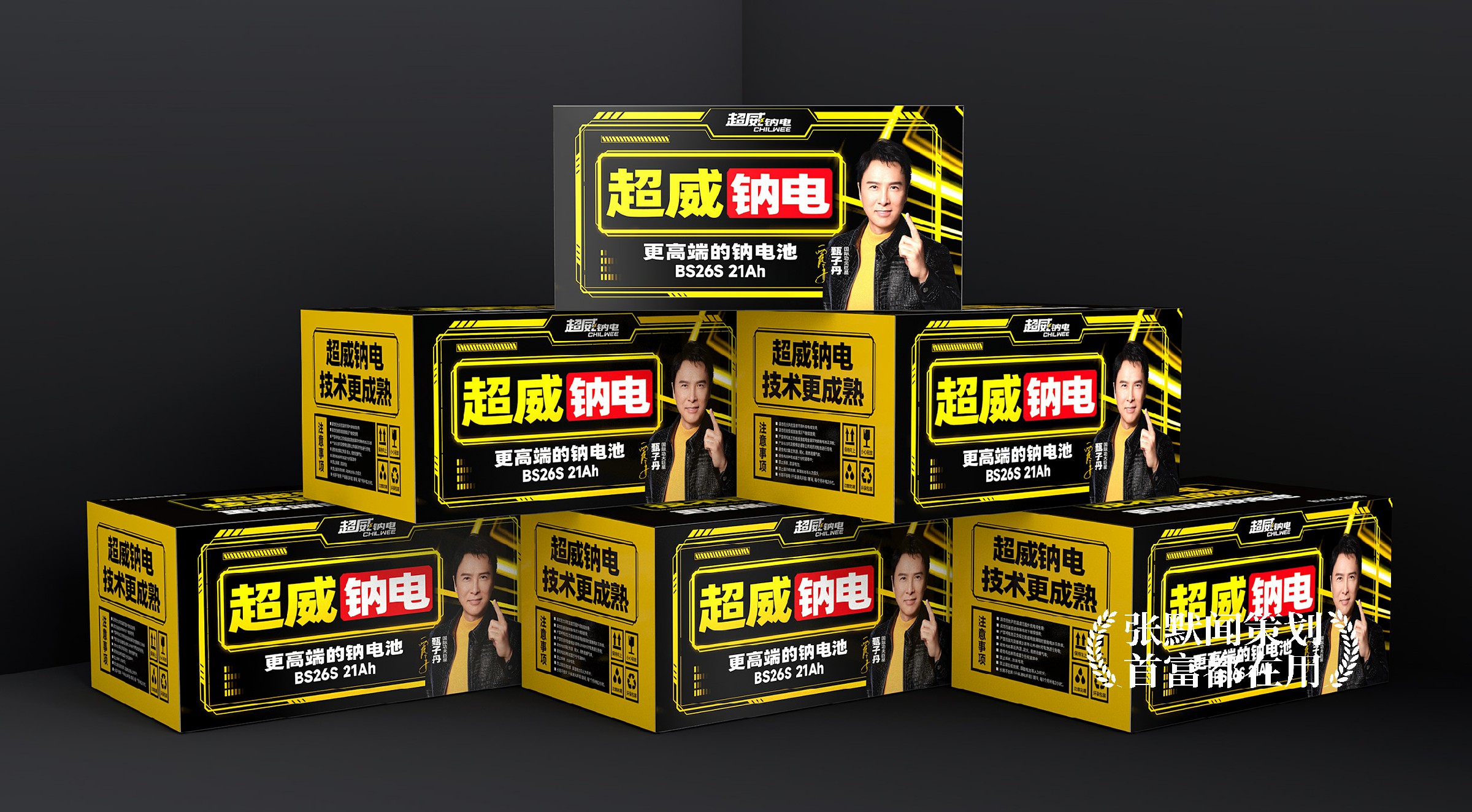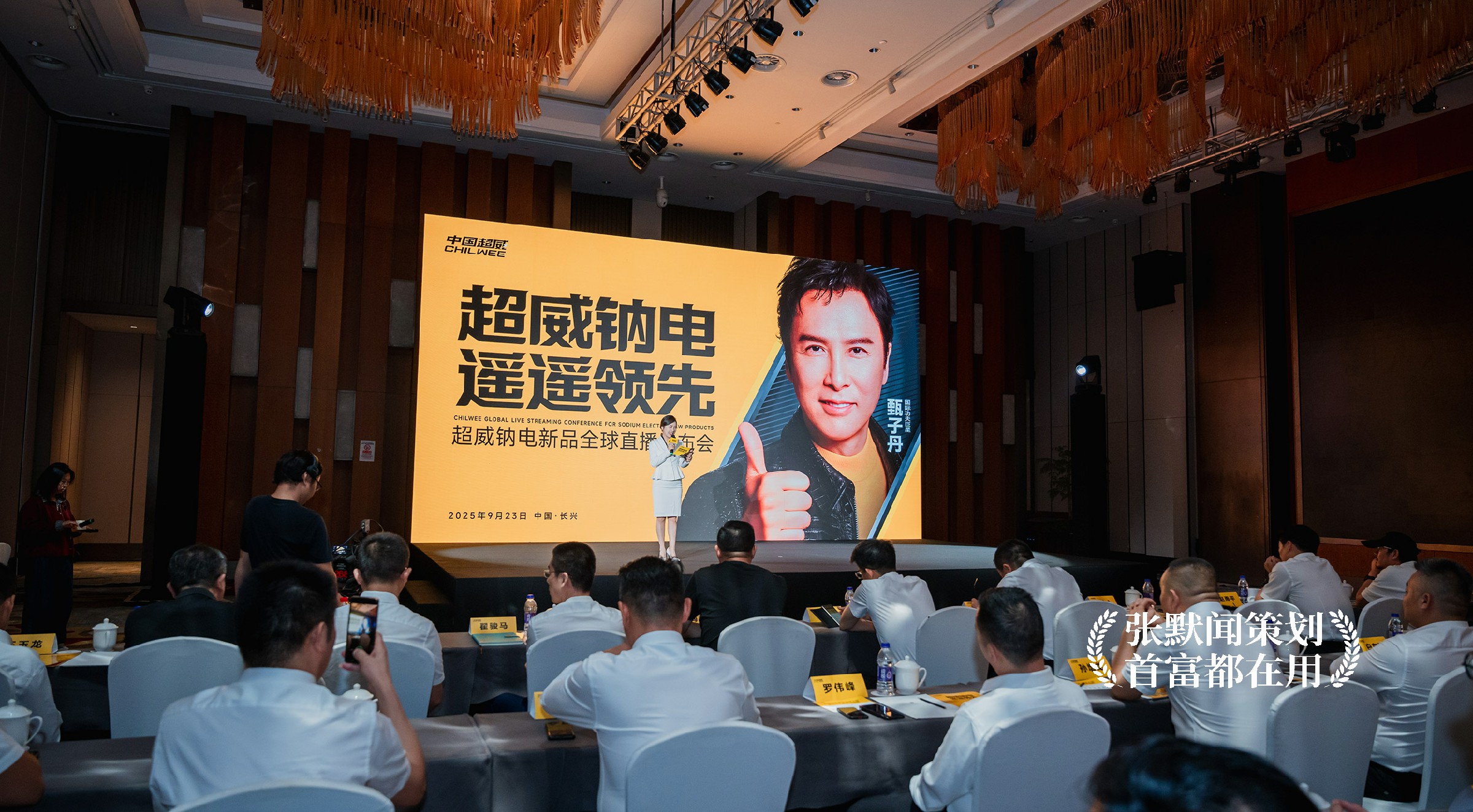 在本次大会的主画面设计上,明亮的超威黄色、醒目的大会主题“超威钠电 遥遥领先”、耀眼的国际功夫巨星甄子丹微笑点赞,三者相互配合,形成强烈的视觉冲击,传递出产品值得信赖的承诺。特别是在代言人甄子丹的形象处理上,银灰色的背景设计与超威黄形成对比,增强了画面的层次感与立体感,让甄子丹的形象和发布会主题更加突出。整个设计沉稳大气,科技感十足,进一步烘托出了超威钠电的品牌实力。