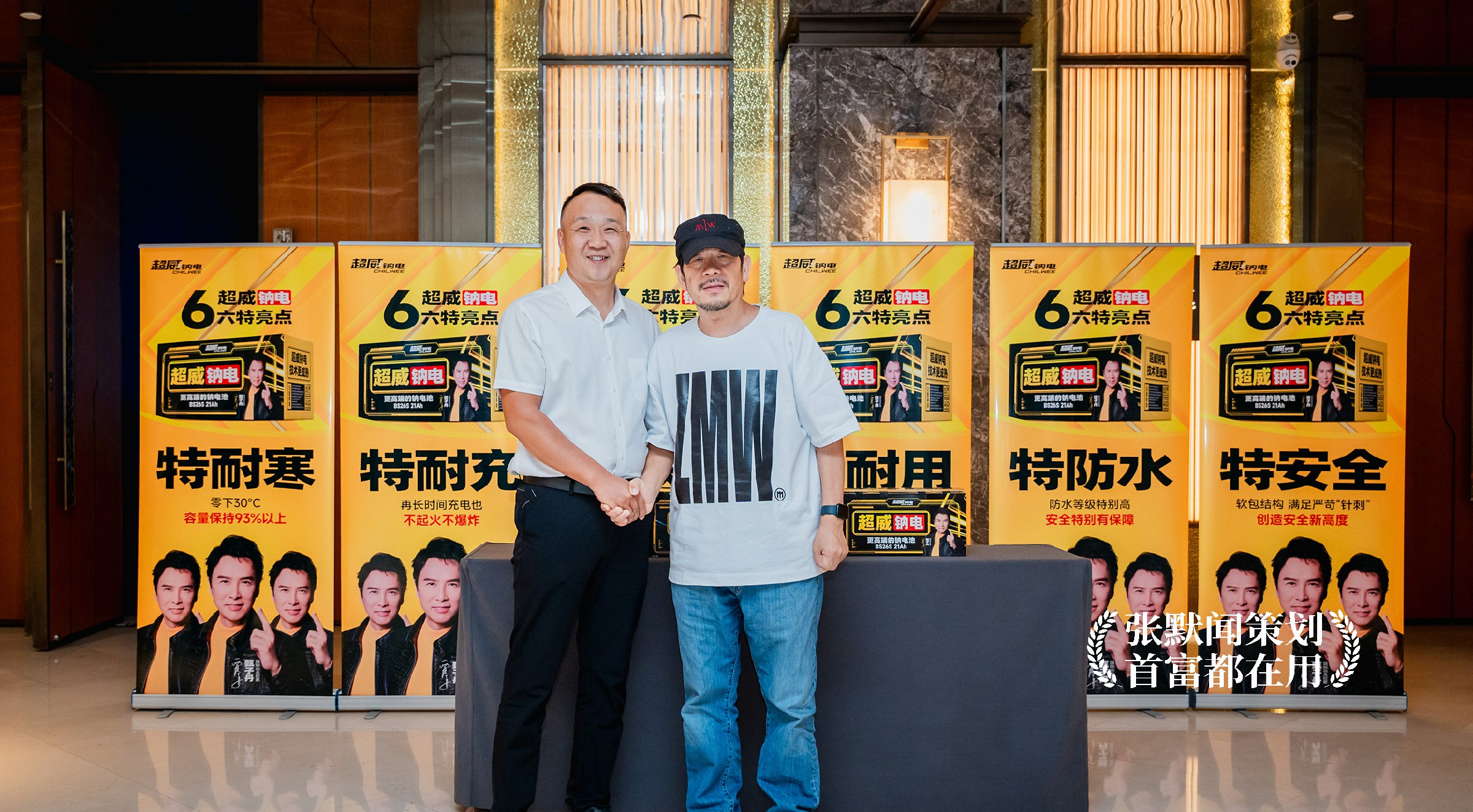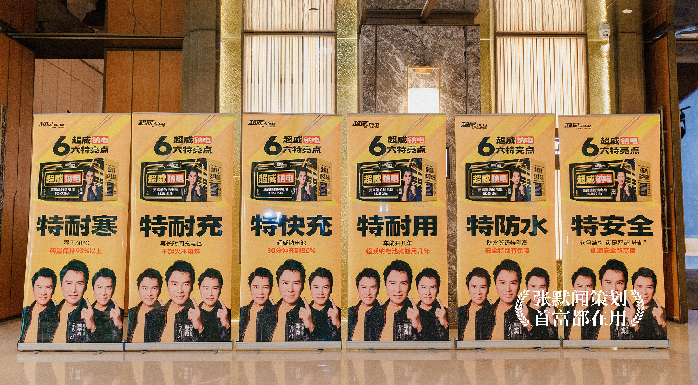 在物料的宣传上,张默闻这厮为本次发布会的新品超威钠电提炼了系列卖点,并设计成易拉宝海报在会场以矩阵形式展出。文案创意上,他精准锁定“6特亮点”——特耐寒、特耐充、特快充、特耐用、特防水、特安全,以“特”字打阵,用无可辩驳的产品力,坚实构建起“超威钠电 遥遥领先”的信任屏障。画面呈现上,主色调超威黄极具视觉冲击力,并放大产品包装,清晰展示“6特亮点”,让代理商和用户快速认知产品。尤为绝妙的是,品牌代言人甄子丹的形象以矩阵式排列,更具气势,更显霸气。发布会现场,超威钠电一组6个系列展架呈一字排开,通过极富张力的视觉呈现,全方位提升了超级新品的感染力与传播力。