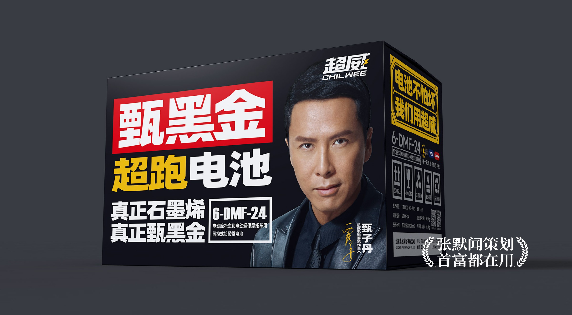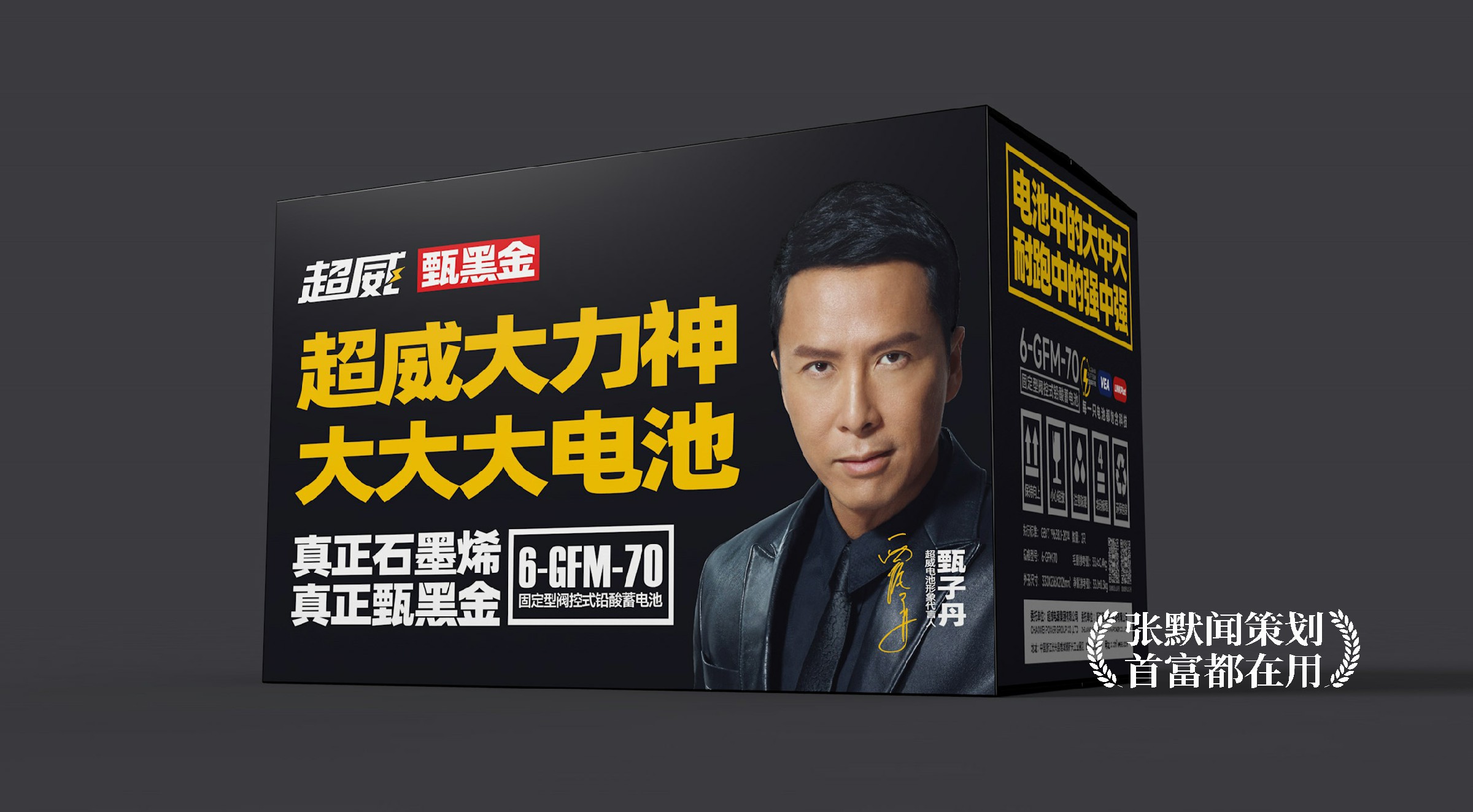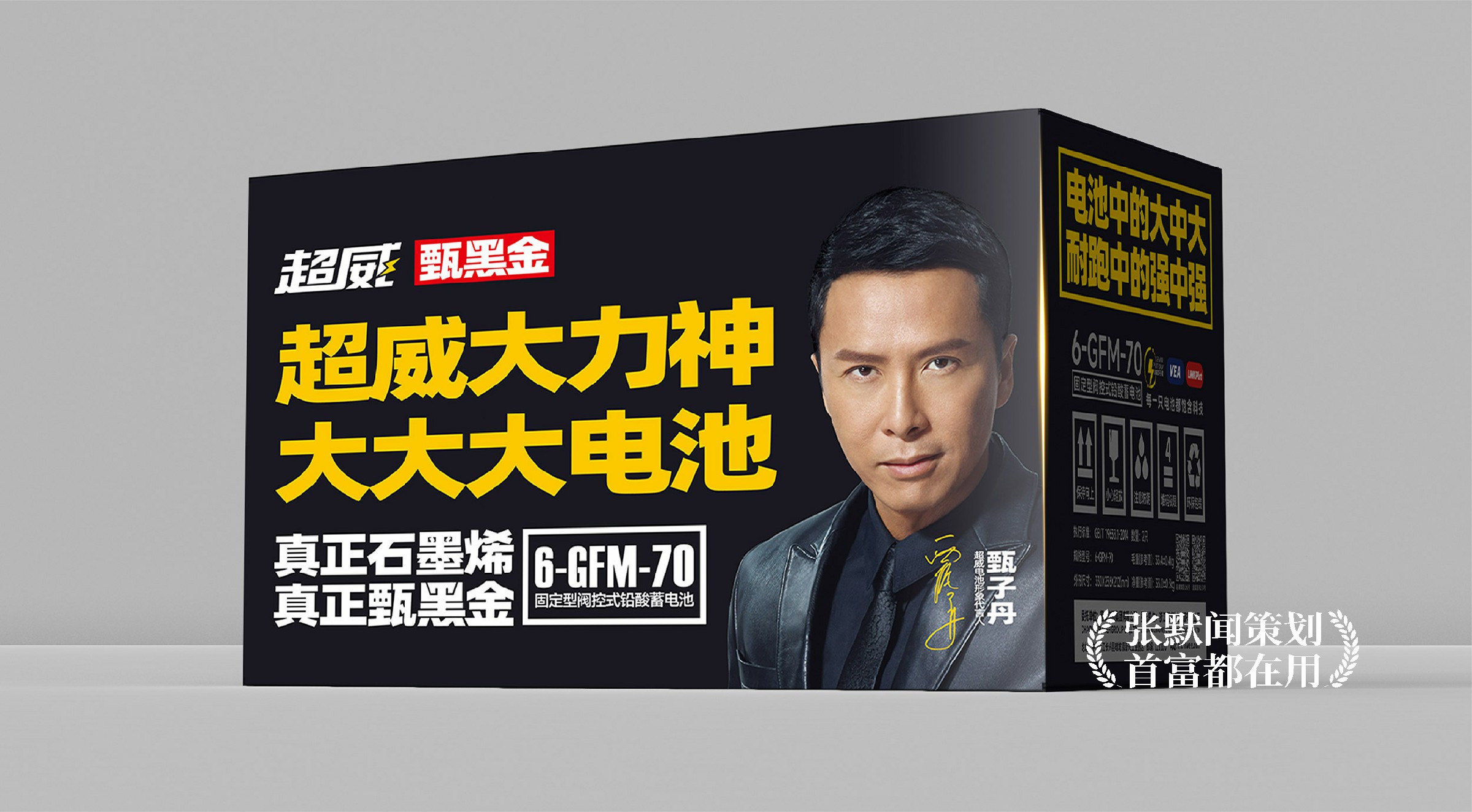 此外,张默闻这厮还分别为两款单品创意了朗朗上口的单品广告语,并亲自操刀新品包装设计。甄黑金超跑电池的广告语“真正石墨烯,真正甄黑金”,连用两个“真正”宣告了产品无可比拟的强大优势。大力神大大大电池的广告语“电池中的大中大,耐跑中的强中强”则突出了消费者非常关注的耐跑性能,强调超威大力神电池的技术之雄厚,性能之优越。在包装设计上,整体延续了超威的品牌色黑黄色调,搭配品牌代言人甄子丹的硬朗形象,尽显超威高端品牌调性。