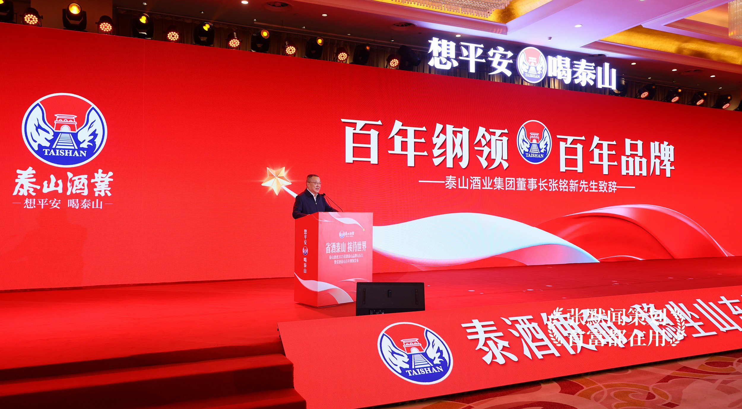 在全场嘉宾的热切期盼中,泰山酒业集团董事长张铭新健步登台,以《百年纲领 百年品牌》为主题,正式发布指引企业未来发展的核心宪章 ——《泰山酒业百年纲领》。他明确指出,这部纲领绝非应景之作,而是立足于 “酿好国人的平安酒” 永恒使命之上的 “发展根本法”,更是企业所有行动的 “初心与归宿”。张铭新郑重宣告,泰山酒业将以 “中国高端浓柔白酒领导者” 为愿景,以 “稳坐山东第一品牌,争做中国小五粮液” 为使命,依托 “三千座国宝金条小窖,亿万年泰山泉水酿造” 的不可复制禀赋,在未来二十年将 “浓柔” 特色推向新高度。他强调,泰山酒业将扛起鲁酒振兴大旗,全力跻身中国名酒之林,为行业发展书写浓墨重彩的篇章。