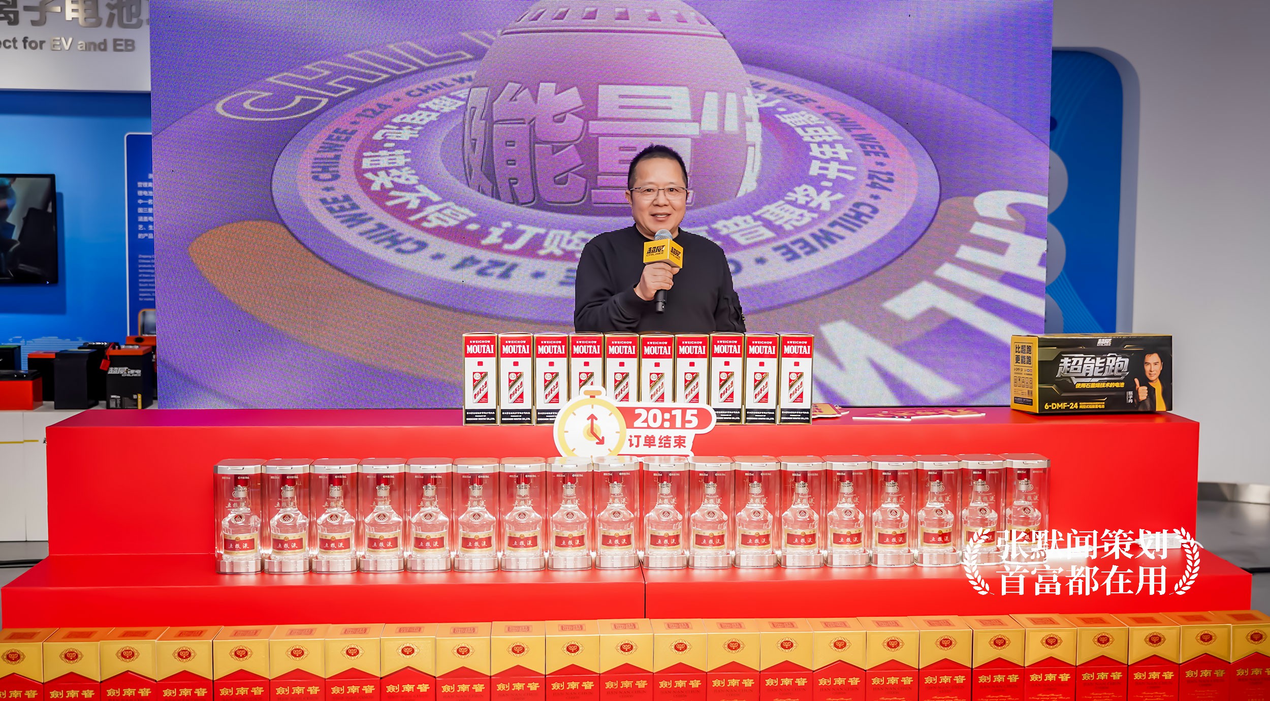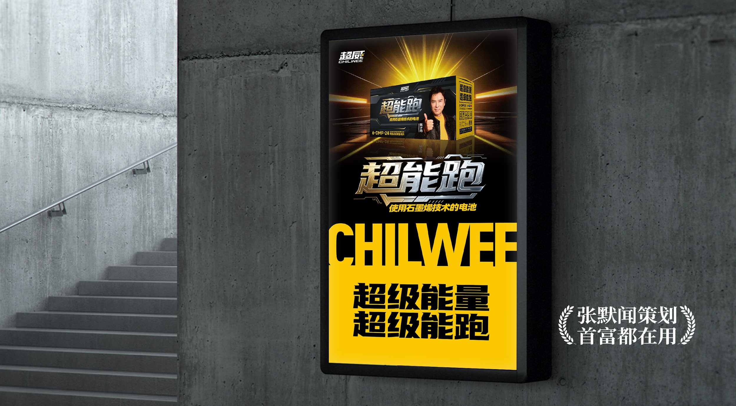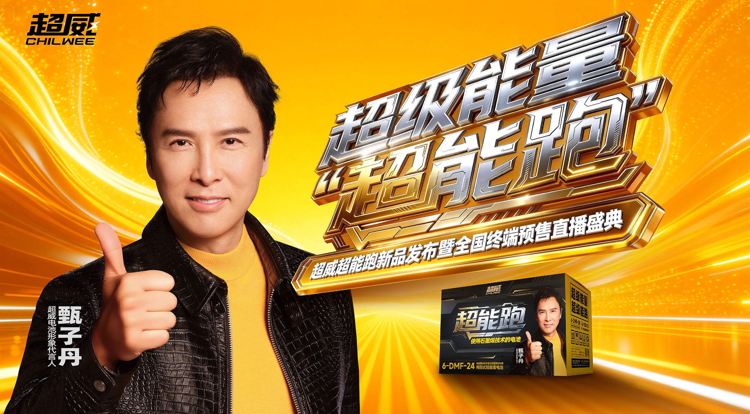 超级大会就是超级营销。为助力超威超能跑电池发布会成功举办,张默闻策划还为超威完成了大会主画面的设计工作。主画面以炽烈的黄色铺陈,犹如燃烧的能量场,构筑出极具张力与动感的视觉磁场,完美呼应“超级能量 超能跑”的大会主题。画面左侧,代言人甄子丹的刚毅形象与品牌内核深度契合,传递出无可替代的力量感与信任势能;画面右侧则聚力呈现大会主题与产品形象,字体磅礴、包装瞩目,在秩序中构建视觉焦点。整个主画面将代言人气场、设计美学与品牌势能融为一体,以视觉统领全局,不仅点燃现场,更为全国终端预售直播盛典注入了强劲的品牌动能。
