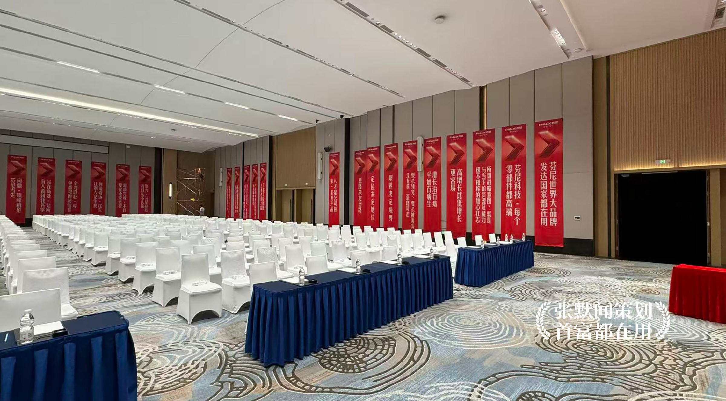 视觉焕新以超高端语言彰显品牌愿景。视觉传达层面,张默闻策划延续并升级了2025全球品牌大会的超高端视觉基因,以“热血红”为主旋律,将芬尼品牌战略转化为直击人心的视觉宣言。大会主视觉以激情澎湃的芬尼红为主色调,以极具冲击力的红色“大于号”作为核心超级符号贯穿全场,彰显芬尼“以高端领跑高端,以先进领跑先进”的领跑者姿态。主视觉背景中,“启航全球新长征 实现芬尼新增长”大会主题由象征能量与热血的“大于号”引领,形成极具科技感与热血斗志交织的的品牌视觉锤。